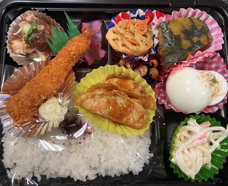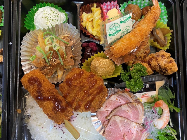 価格は650円(税込)で、唐揚げ・肉団子・だし巻き玉子・ヘレカツ・エビフライorメンチカツなどが入ったお弁当です(内容に変更がある場合もあります)。あっさりめがご希望のお客様には、エビフライのところに焼魚、肉団子のところに和惣菜など、ご要望に応じて変更しています。